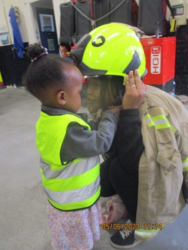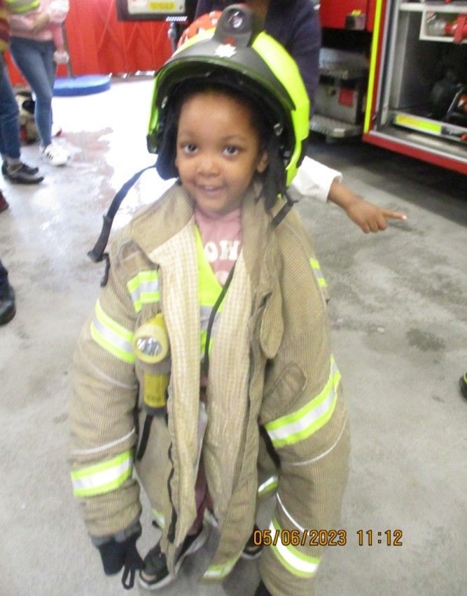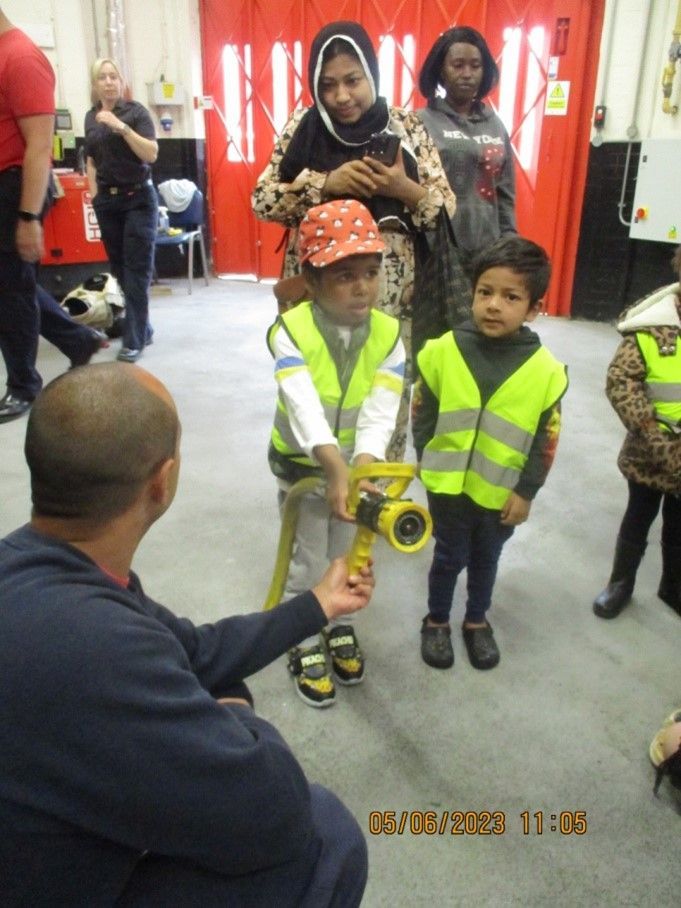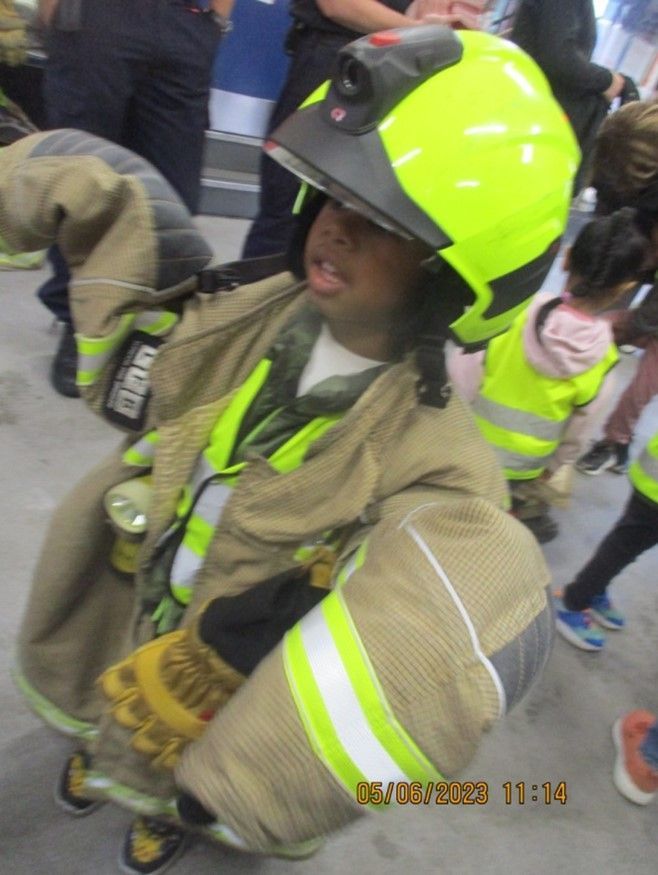 Walking to the station with the volunteer parents, meeting the firefighters and talking about what they do and how they help us, going in the fire engine and hearing the siren go off, putting on the firefighter jacket and helmet and pretending to be firefighters, and holding/shooting the water hose.
