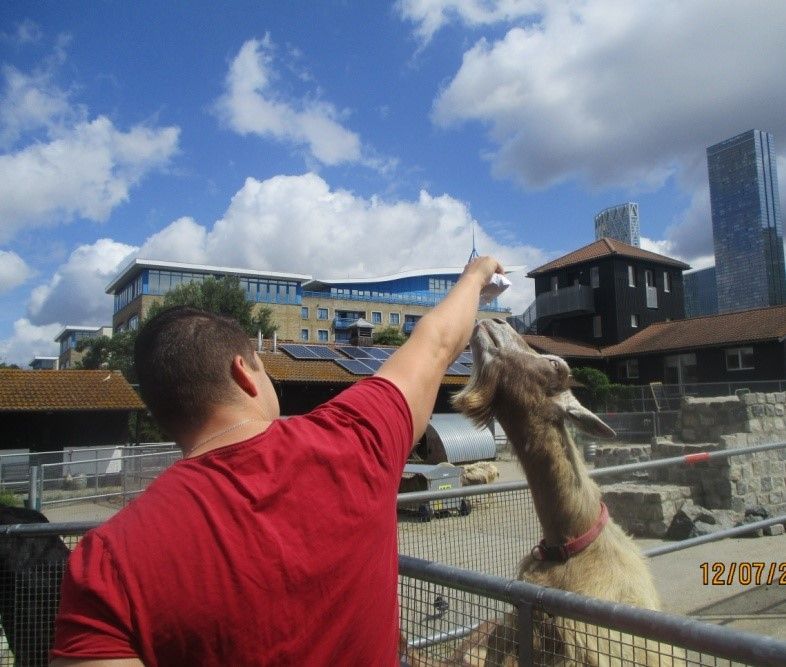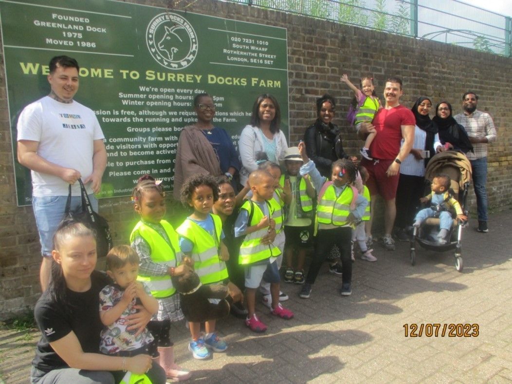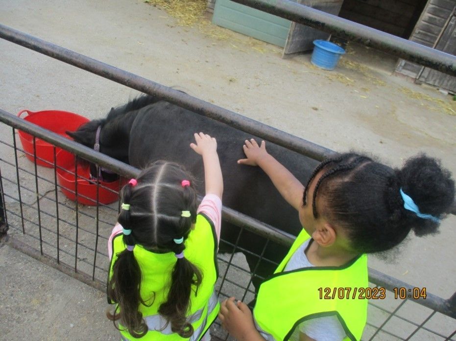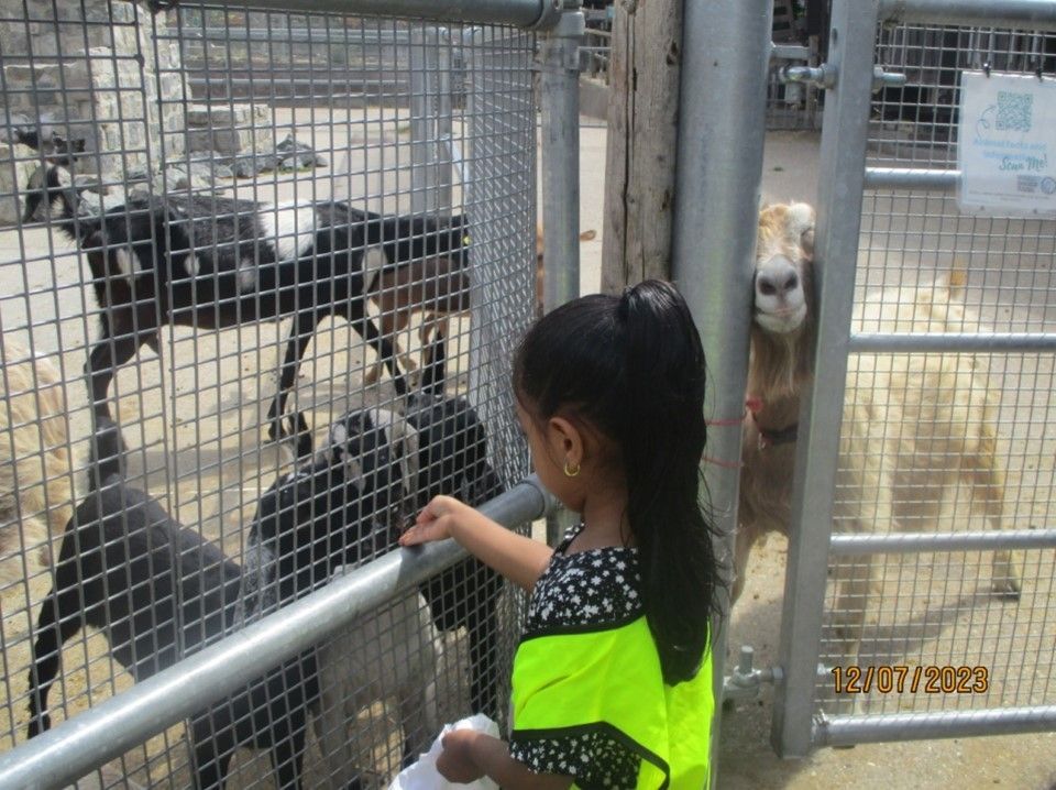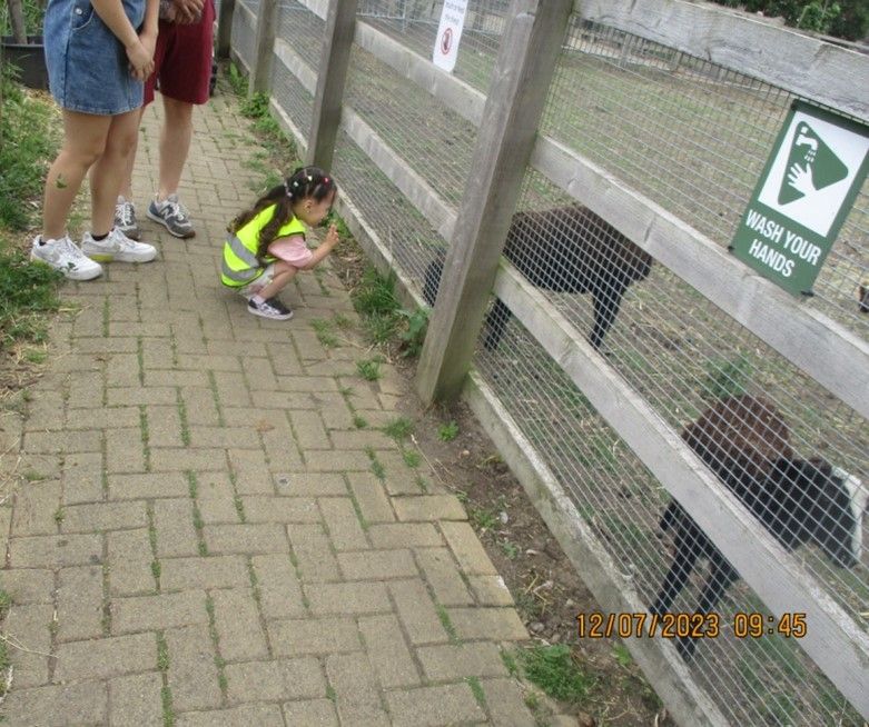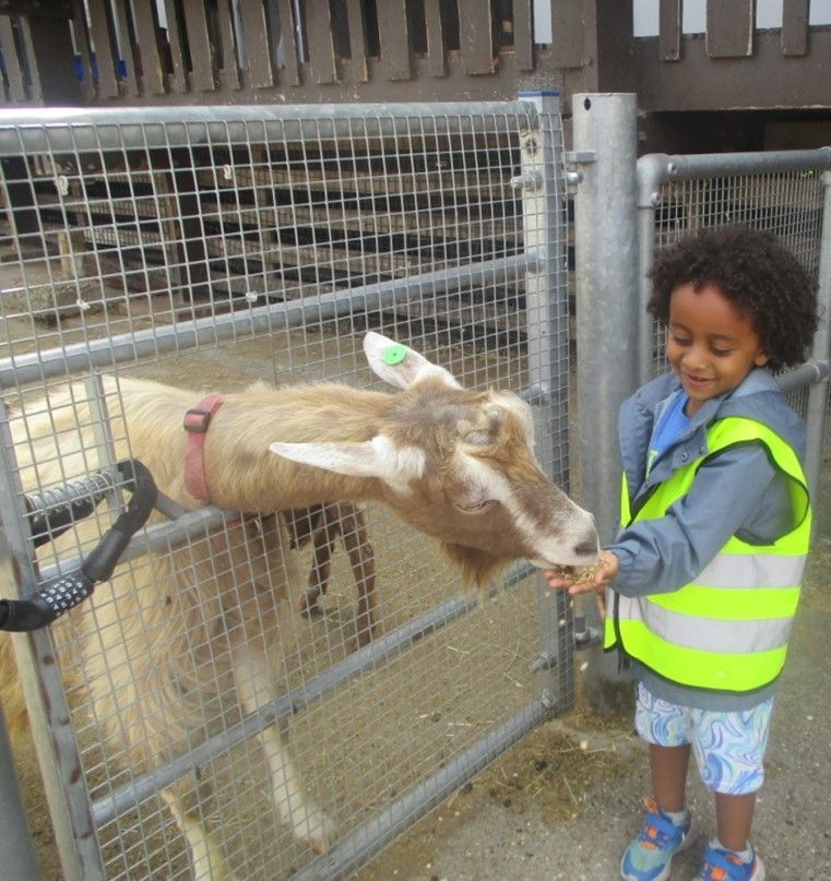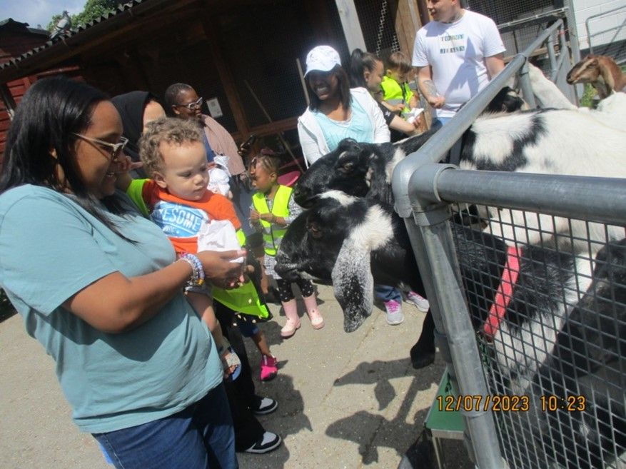 Going on the bus with the children and the parents, observing all the animals and naming them, touching/feeding the animals, washing hands regularly, and seeing the plants, flowers, fruits, and vegetables.